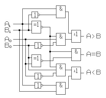 A kétbites számok teljes összehasonlítását végző komparátor logikai vázlata az ábrán látható.