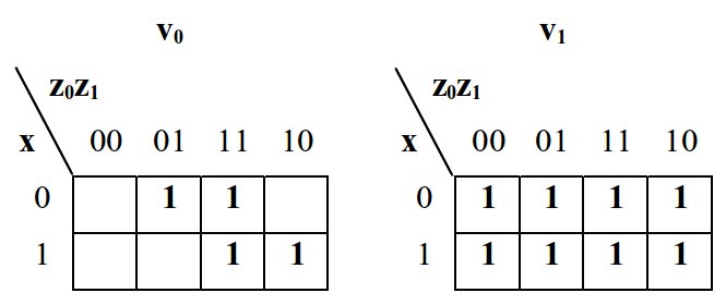 Az állapottáblázatból mind v0-ra, mind pedig v1-re felírható egy-egy háromváltozós Karnaugh-diagram. Ezek segítségével pedig a kombinációs hálózat már megtervezhető.